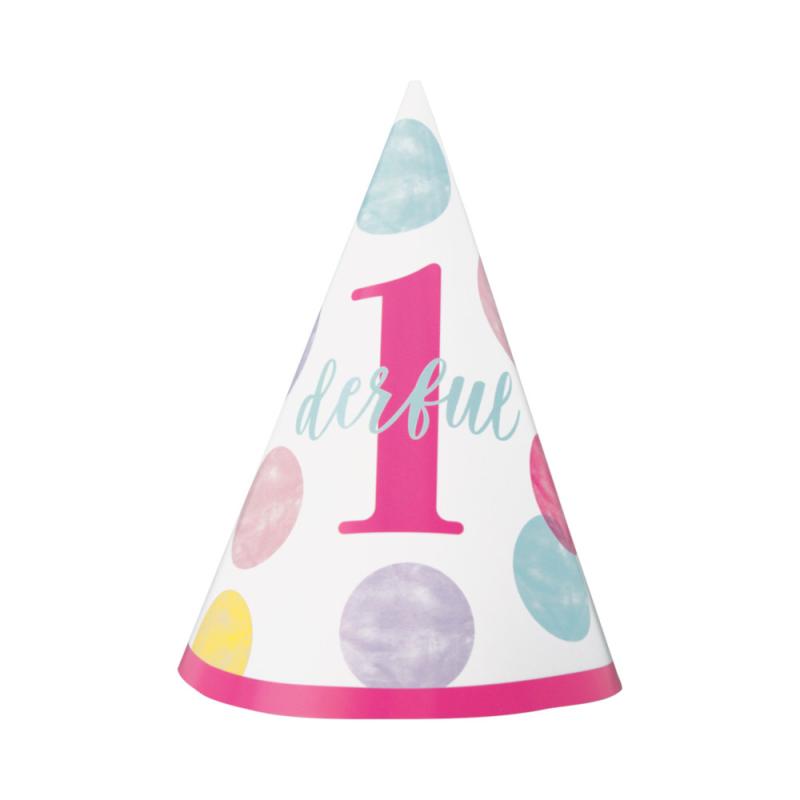 Sørg for en flot festhat til pigen, der skal fejre sin 1 års fødselsdag.Festhatten er med skønne balloner og teksten ‘1derful’.Festhatten har et blødt silkebånd i lyserødt forneden, som du kan binde under hagen. (Læs mere)